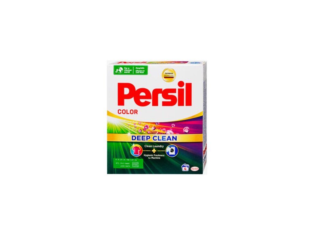 Prací prášok Persil Color je určený na farebné prádlo a je vhodný pre všetky druhy pračiek a na ručné umývanie. Účinne odstraňuje škvrny a nečistoty z prádla už pri 20°C a zanecháva ho svieže a jemné po niekoľko dní. Nižšie teploty zabezpečia to, že vlákna ostávajú po dlhšiu dobu v pôvodnom stave. 4 pracie dávky. Šetrný k oblečeniu.